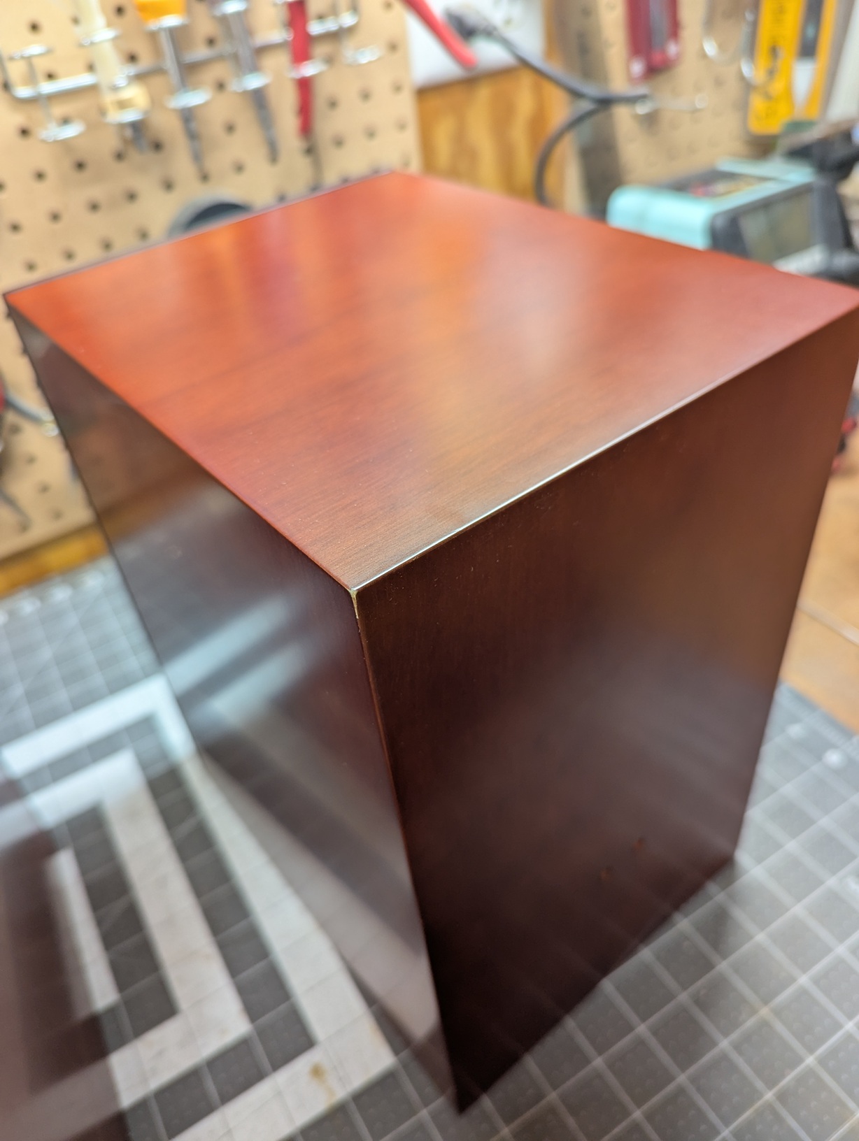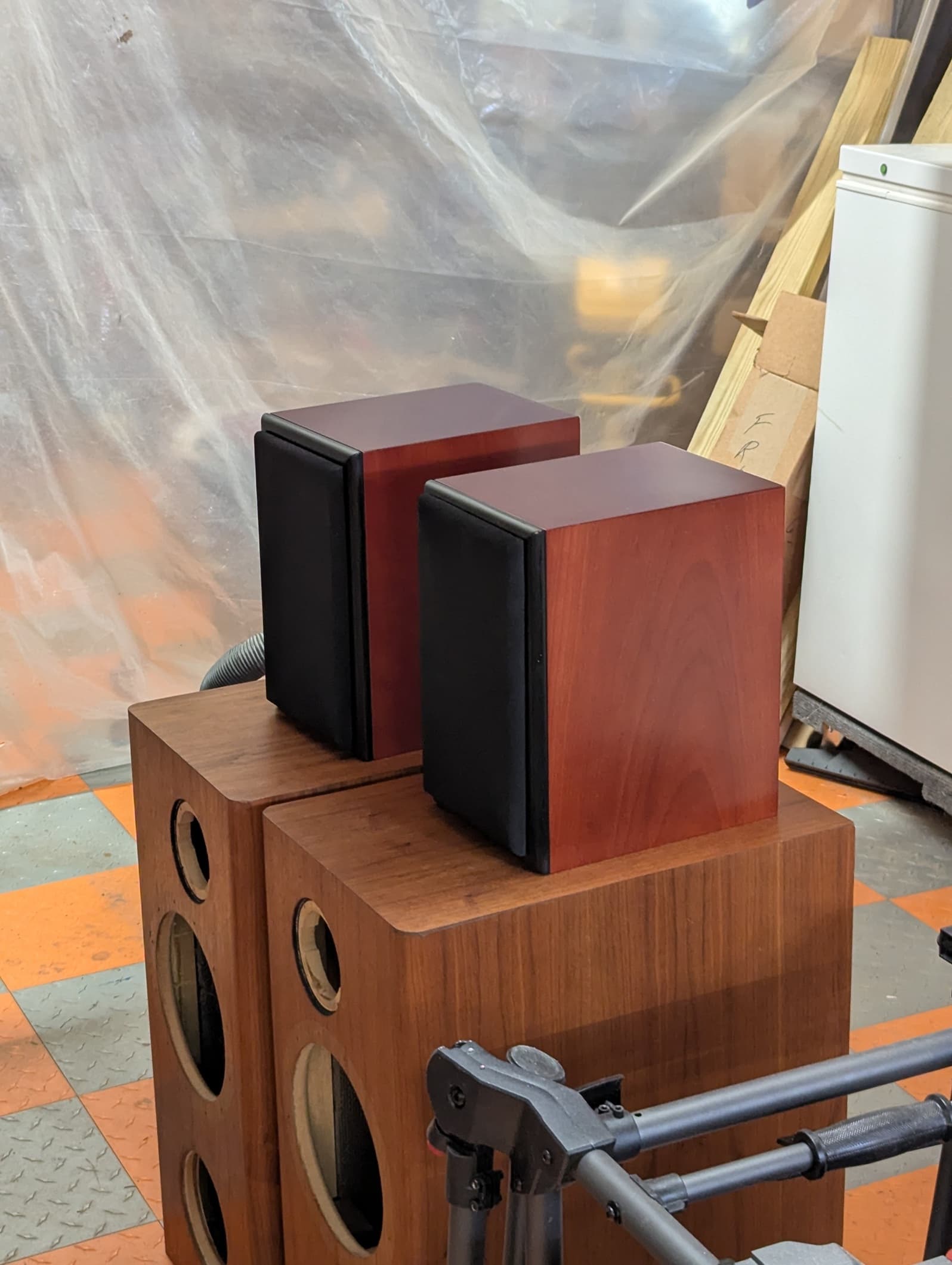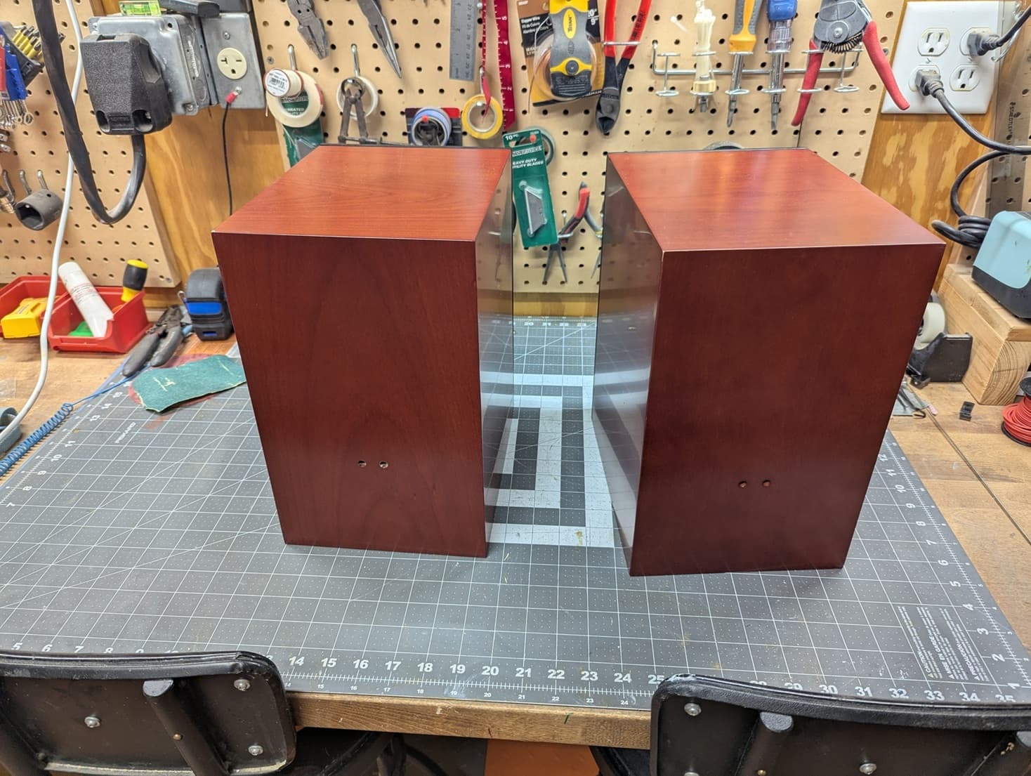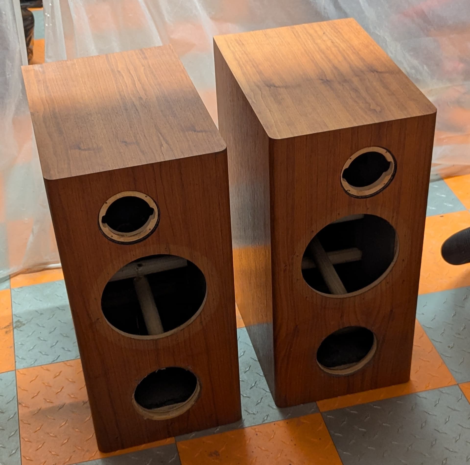 Best Offer / Pickup only (due to freight weight). One pair of 2.2 ft3 well-braced MDF enclosures. These are 3/4 MDF and veneered with Walnut, with a slightly red tint. These have crossing dowels and corner blocks.