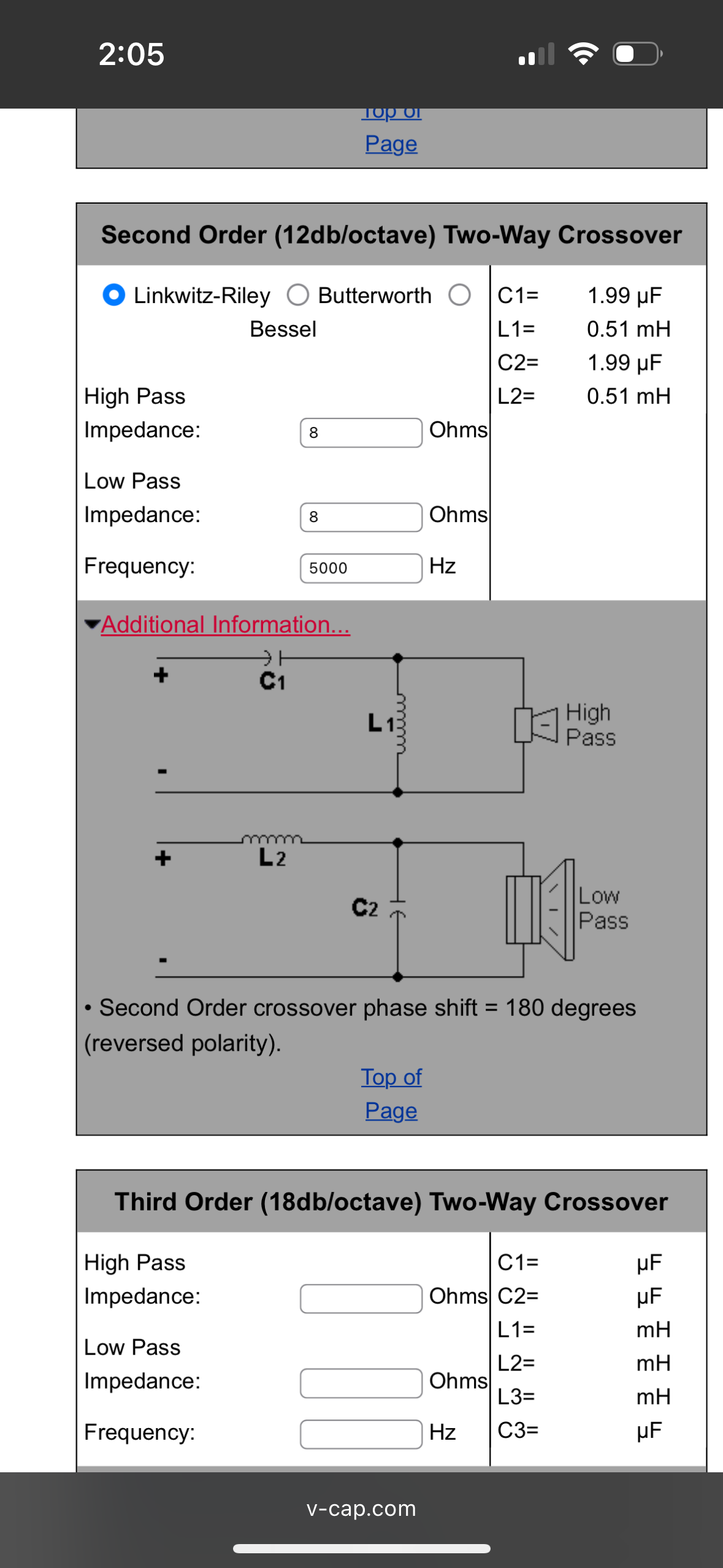 When your drivers have a purely resistive load of the exact value used in these calculations (the value you entered for “impedance”), then the crossover will be picture perfect! The problem is that most drivers have a load that is reactive and its impedance varies with frequency. So the online calculators will spit out some values, but the results when you build it up with the components shown, which also come with a tolerance on their values, may let you down and sound poor.