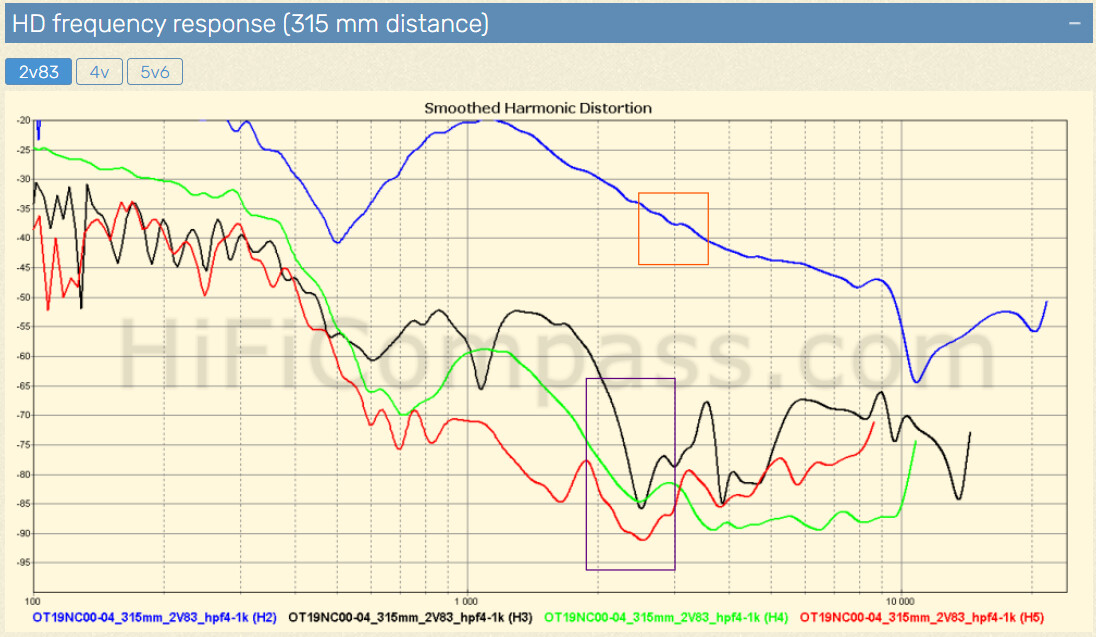 Starting with the orange box. The second order distortion is around -40 dB (1%) at 3.5 kHz. At 2.5 kHz, we are at about -35 dB (2%). With a 2.5 kHz crossover in place, the response is likely reduced by 6 dB at that point - and a waveguide will likely further provide some reinforcement. Higher order distortion (purple box) is less than -60 dB (0.1%) down to 2 kHz. -65 dB is about 0.05%. Distortion levels (3rd, 4th and 5th order) are starting to rise below 2.5 kHz, which seems like signs of stress. Elevated odd order distortion will sound harsh. The 2.83 drive level will produce 88.8 dB according to the data provided in the HiFiCompass report. The higher drive levels (4V and 5.6V) represent 3 dB increments, so 91.8 dB and 94.8 dB. You also gain 3 dB or output by running a stereo pair, so even 2.83V is a pretty high drive level.