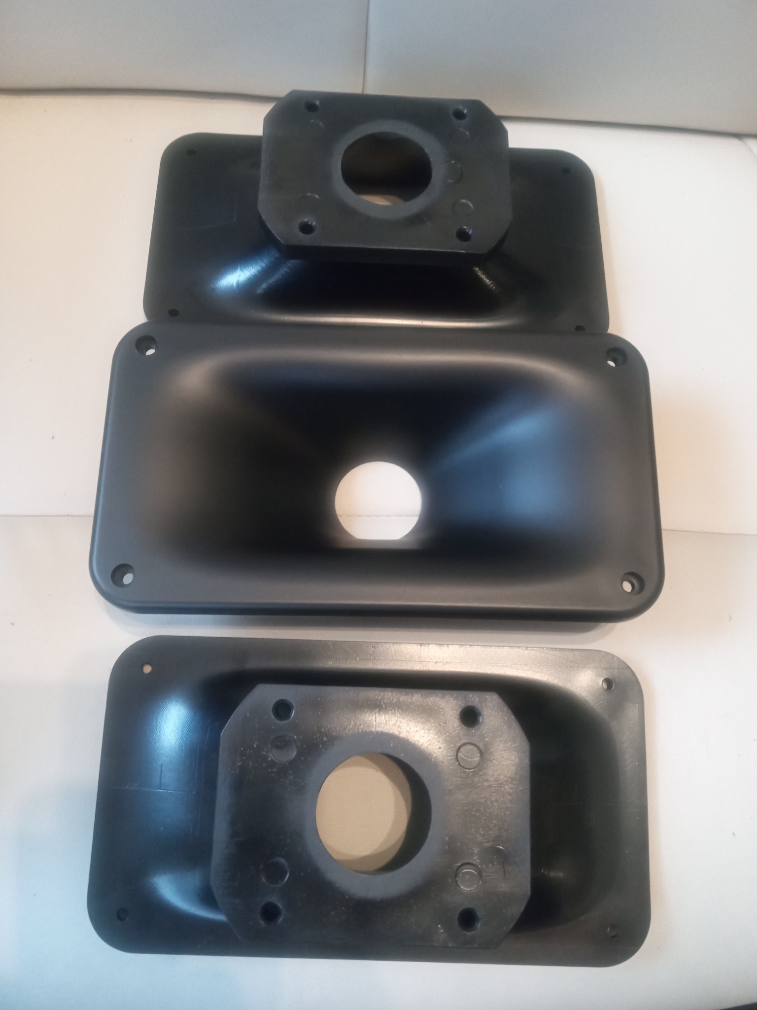 These things are super chunky! Very thick material. 5/16" outer flange. 3/8" driver flange. They gave the driver sealing surface a light sanding, and did a good job cleaning up the throat. They only listed glossy finish ones, but sent satin finished ones. No complaint from me, I prefer satin anyway. The dimensions seem a little larger than they list (~8 5/16"W, 4 9/16"H, 2 1/8"D)