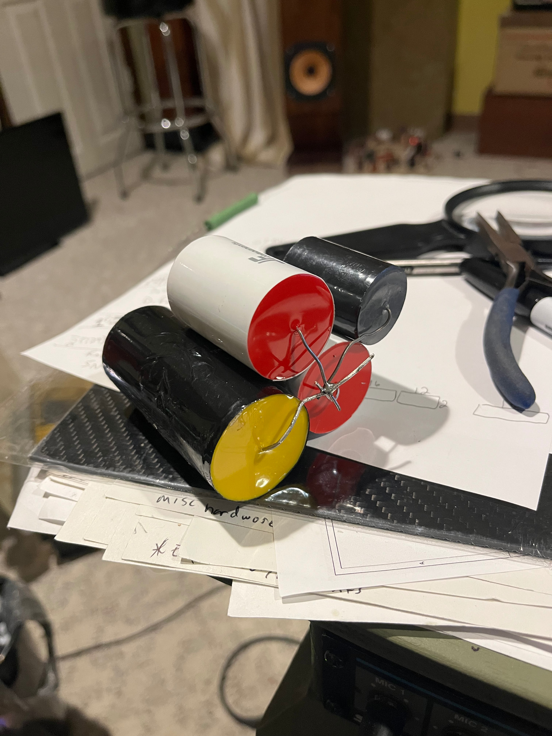 In the order I mentioned, I thought 33’s were the biggest, turns out I had two 47’s. So those, a 50 Dayton and a Jantzen 10…155uF. ESR is .29. Better than the electrolytic, but not as good as I’d hoped and a hell of a conglomerate.