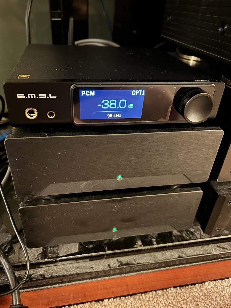 The IcePower 300AS1 amps are being fed by a SMSL RAW-MDA1 DAC, using the built in volume control of the DAC. This combination sounds really, really good. (That’s reviewer-speak.)