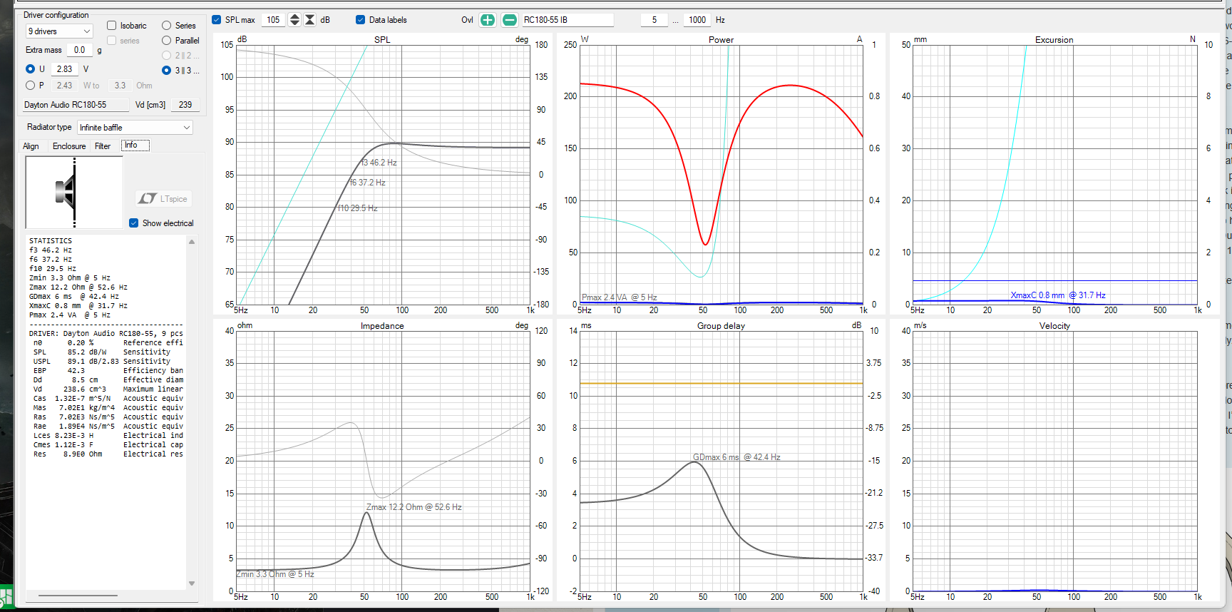 According to VituixCAD, the RC180 models really quite well when open back (or in a closed box with basically infinite volume). Of course, it has terrible efficiency so we’d need a lot of them to bring up the sensitivity to something reasonable. In this case, nine per side.