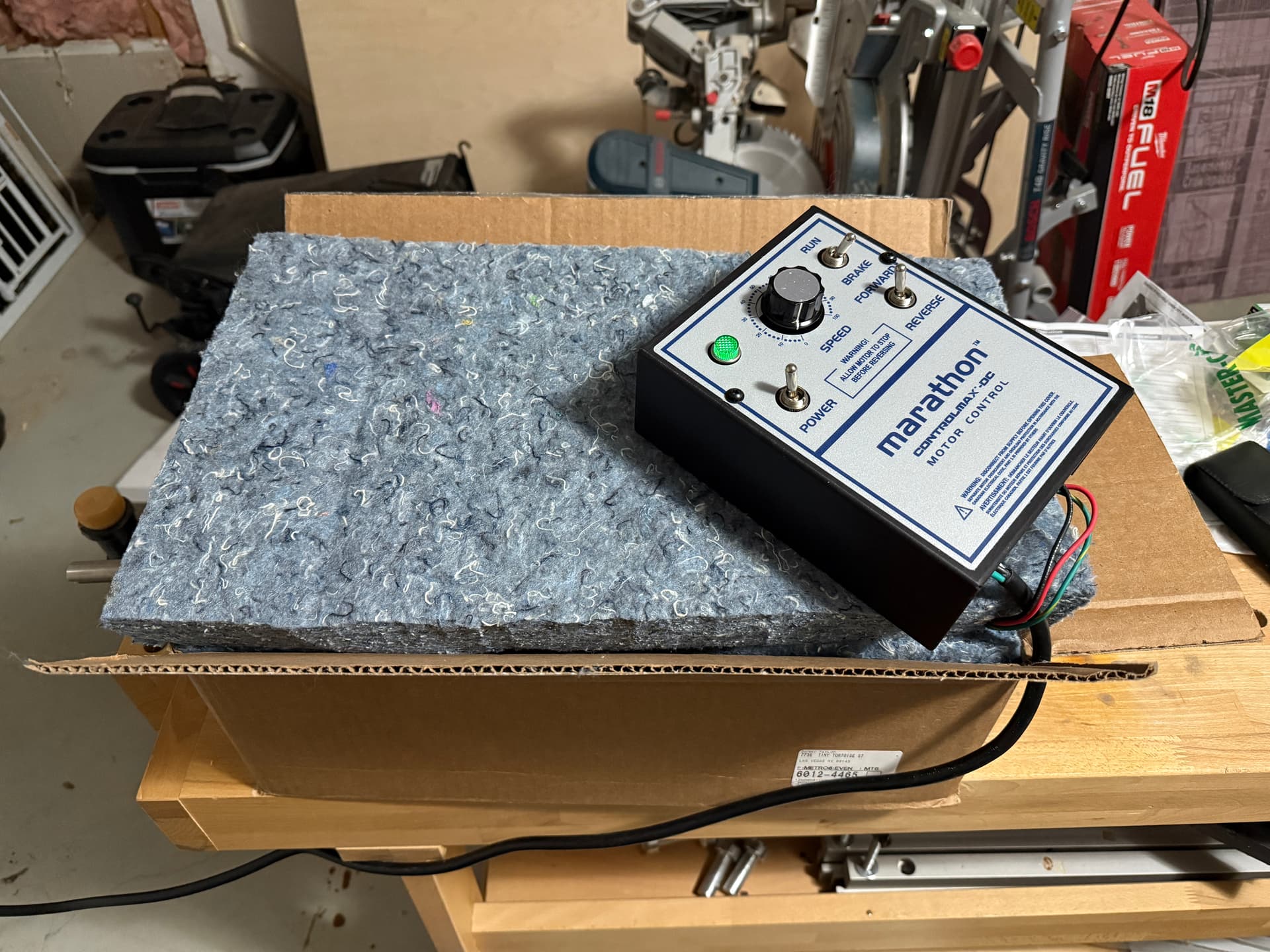 Last night I found a perfect cardboard box in my recycle pile for testing the motor again. This time I placed the motor on four ~3/4” thick sorbothane mounts, then place 2” denim insulation along the sides and top. I cut a hole in the cardboard for the driveshaft to emerge from, but did not place insulation on either end. Noise was still evident, but the meter dropped back down into the low 40s. I’m thinking a more robust enclosure (made of wood) and perhaps a more appropriate sound insulator (something designed for whatever pitch it makes) on all six sides would bring this further down. Applying some mass loaded vinyl to key portions of the motor may also help.