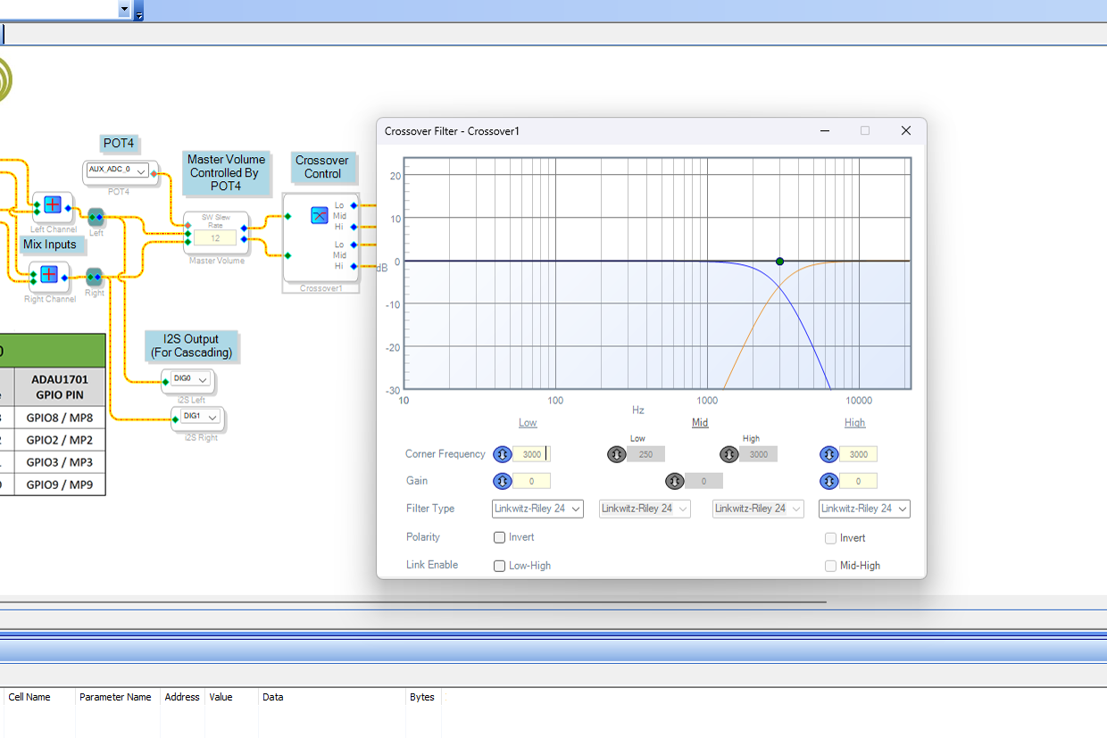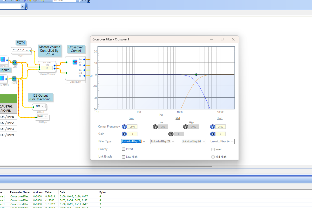 I could then start modifying the settings on the KABD board. At this point any adjustments you make in Sigma Studio are applied to the KABD in real time. None of your changes are permanent at this time.