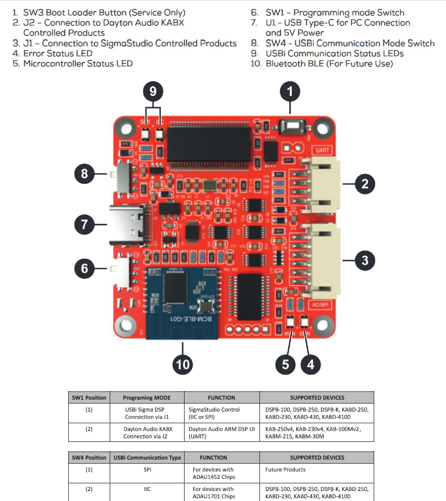 There are two switches on the card that need to be in the correct position. They’re labeled 6 and 8 on the quick reference page which are switch 1 and switch 4 respectfully. There are labels on these switches on the bottom of the board and switch 1 is labeled USB Mode and should be set to USB1. Switch 4 is labeled USBi and should be set to IIC. Once you have the switches set you can connect the board to your PC which should have SigmaStudio running with a USB cable. When powered the RUN (#5), and II2 (#9) LED’s should be green and ERR(#4) should be red. PE tech support said they didn’t even know why the ERR LED was there because they get calls, including mine, all the time. Ignore it.