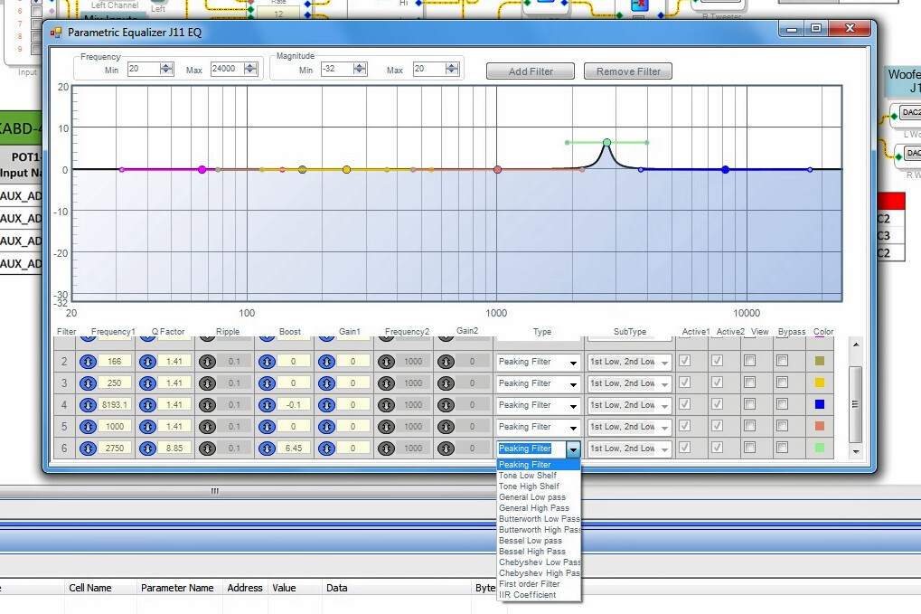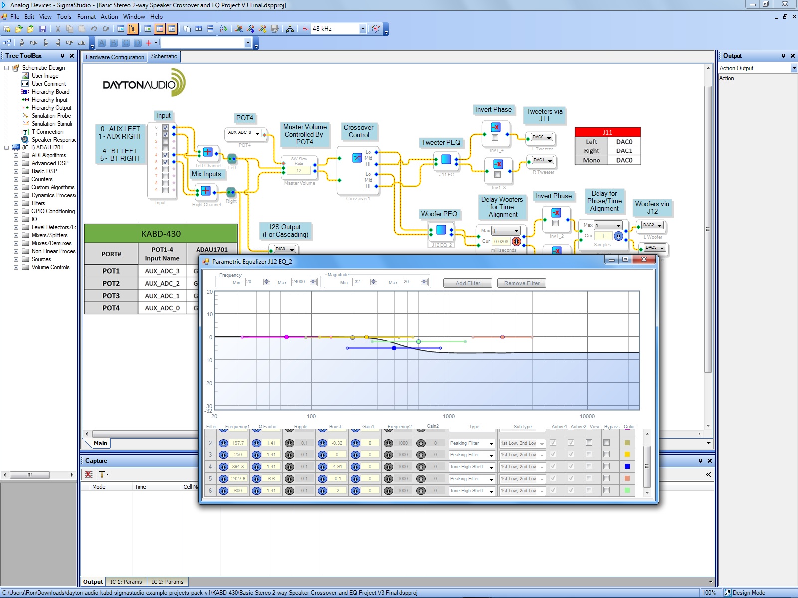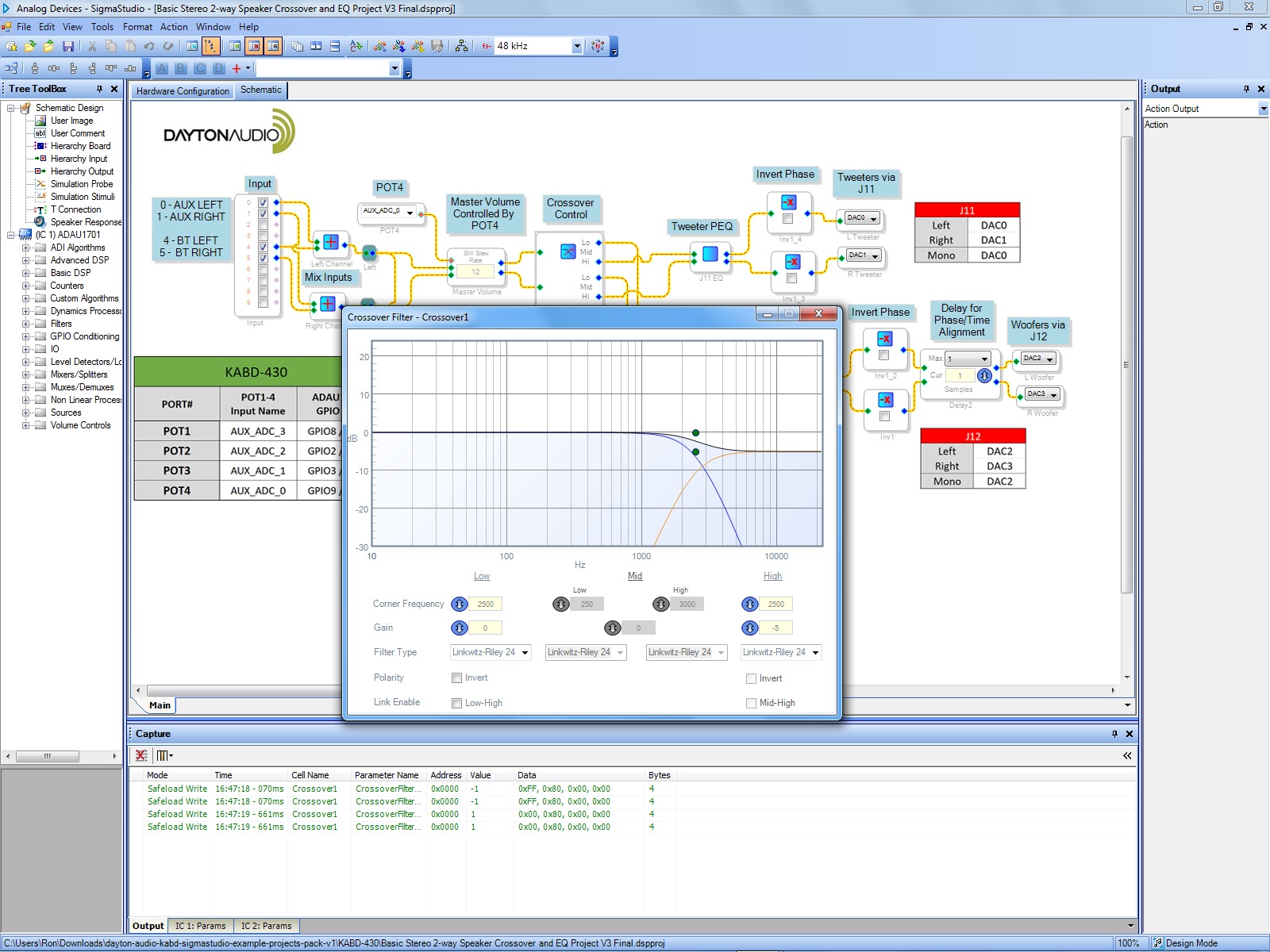 The next thing I did was open the “Basic Stereo 2-way Speaker Crossover and EQ Project” sample file from the “dayton-audio-kabd-sigmastudio-example-projects-pack-v1\KABD-430” folder. The first thing you should do is change the “Delay Woofers For Time Alignment” max value from 23 to 1. That setting is out of range and will drive a memory error. It’s the reason I initially set the board aside. PE tech support knew all about this problem and why someone doesn’t edit the file and resave it I don’t know.
