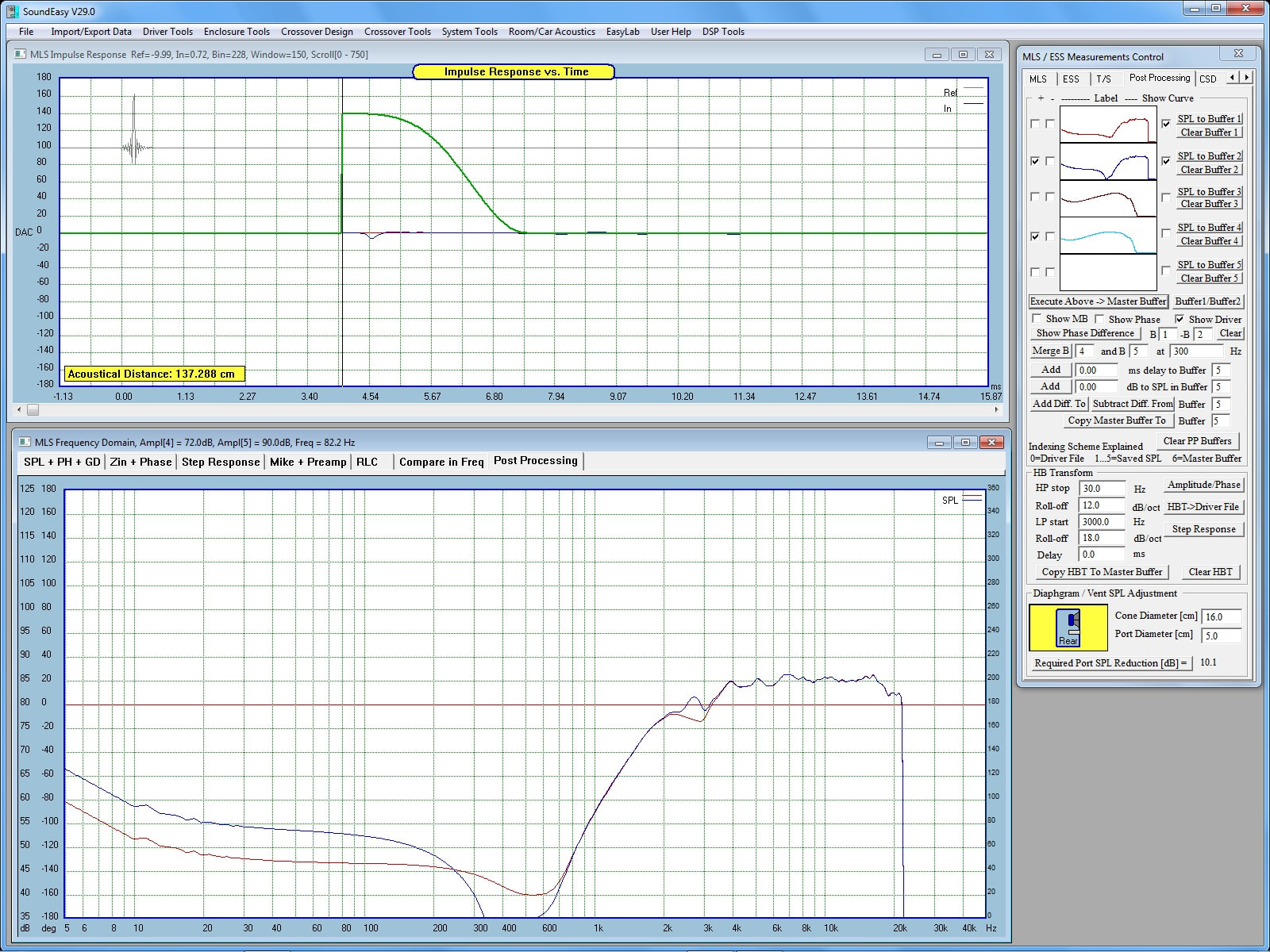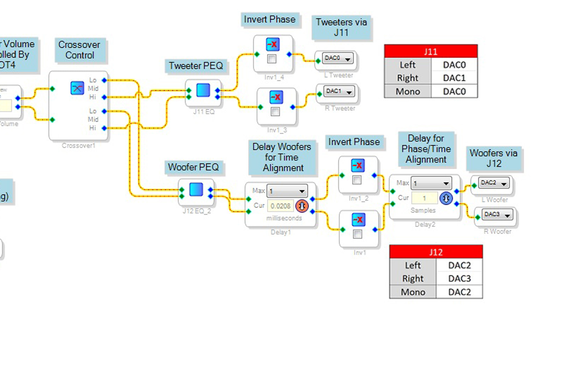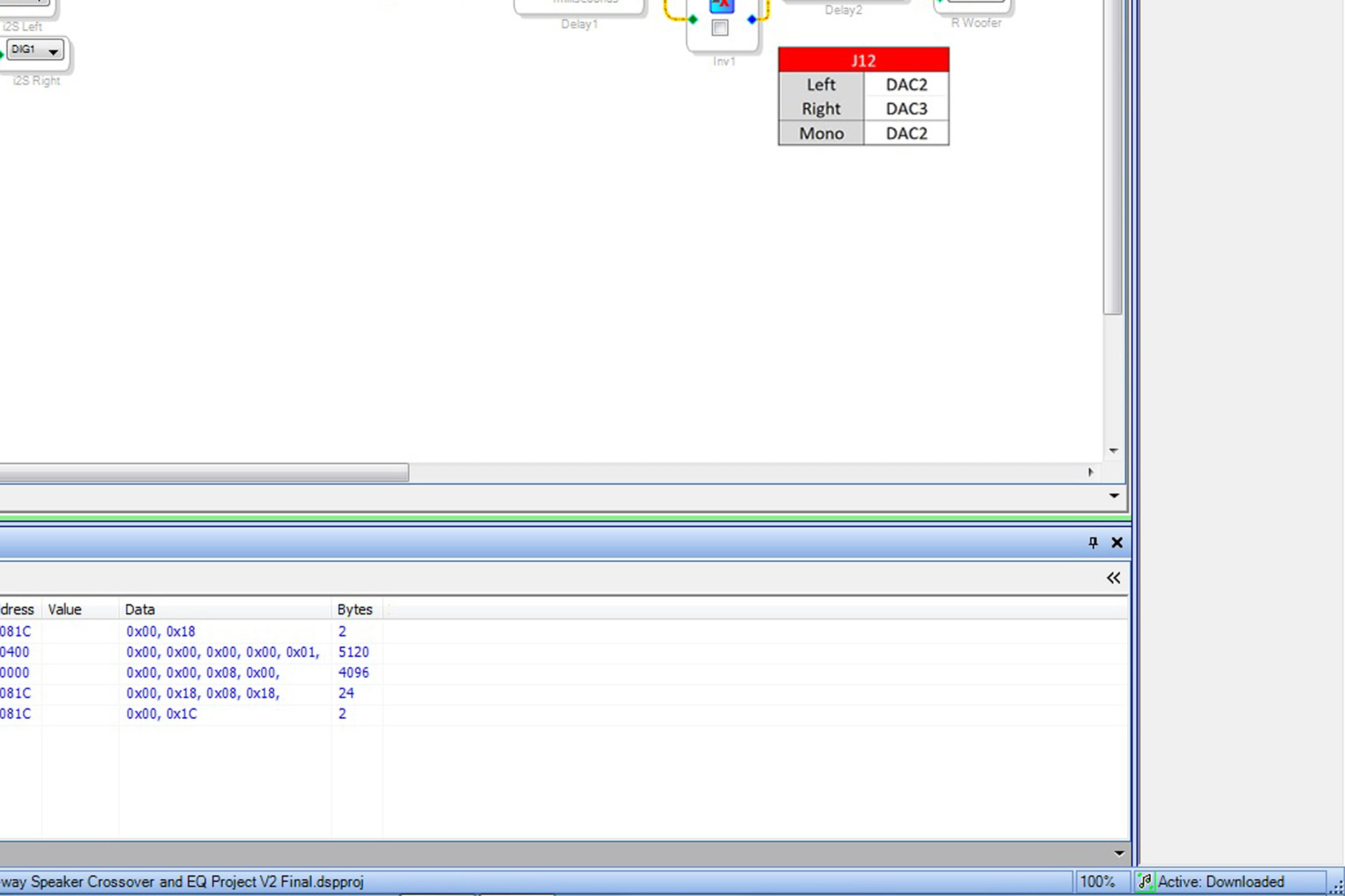 The next thing I did was open the “Basic Stereo 2-way Speaker Crossover and EQ Project” sample file from the “dayton-audio-kabd-sigmastudio-example-projects-pack-v1\KABD-430” folder. The first thing you should do is change the “Delay Woofers For Time Alignment” max value from 23 to 1. That setting is out of range and will drive a memory error. It’s the reason I initially set the board aside. PE tech support knew all about this problem and why someone doesn’t edit the file and resave it I don’t know.