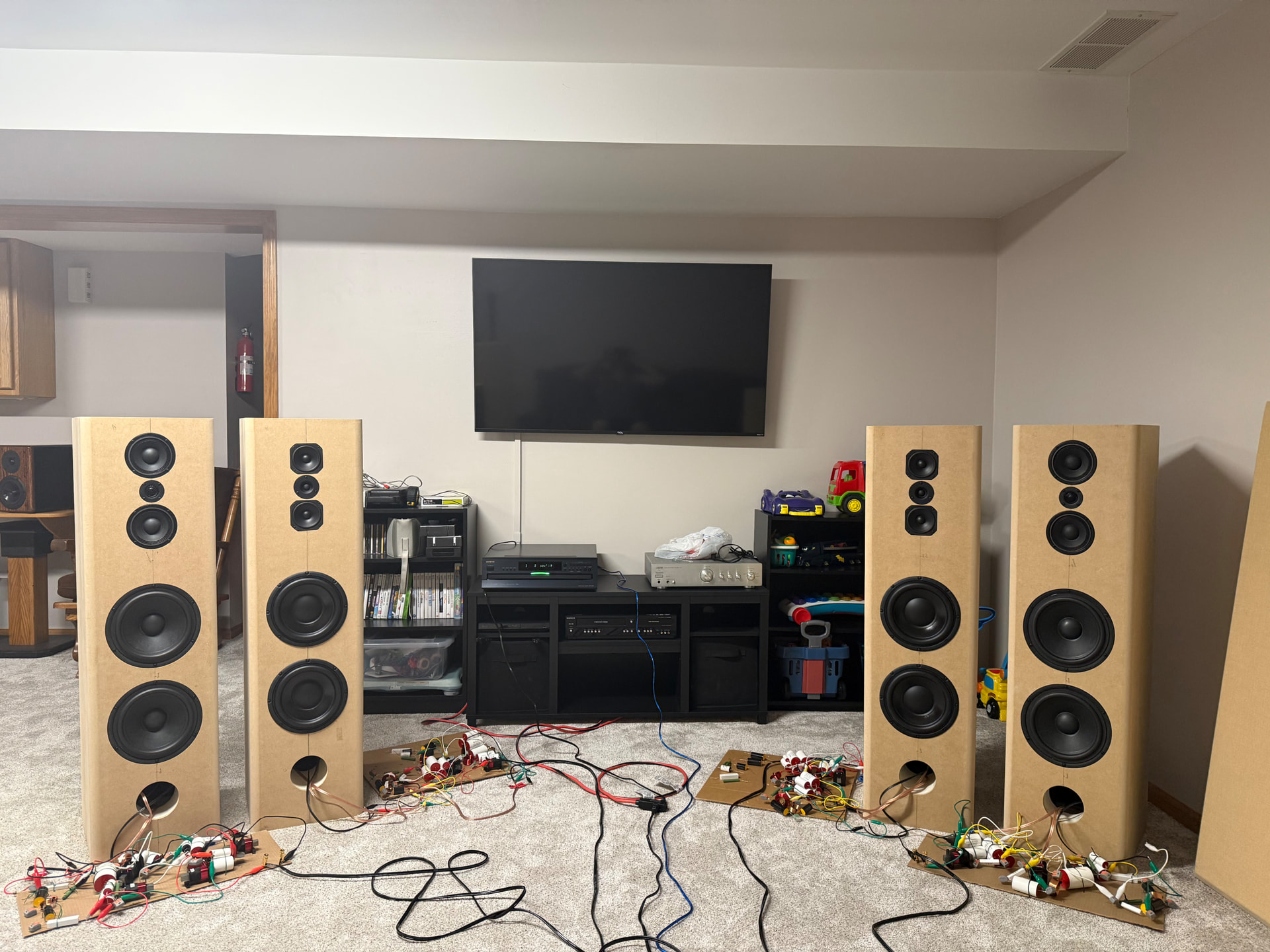 I think I’m getting close on these. Hopefully Ben can make it over next weekend and tell me if I’m close or deaf. I had to drop the tweeter level on the Alpha’s to keep them from sounding too bright, and I had to increase the tweeter level on the Peerless to keep them from sounding dead.