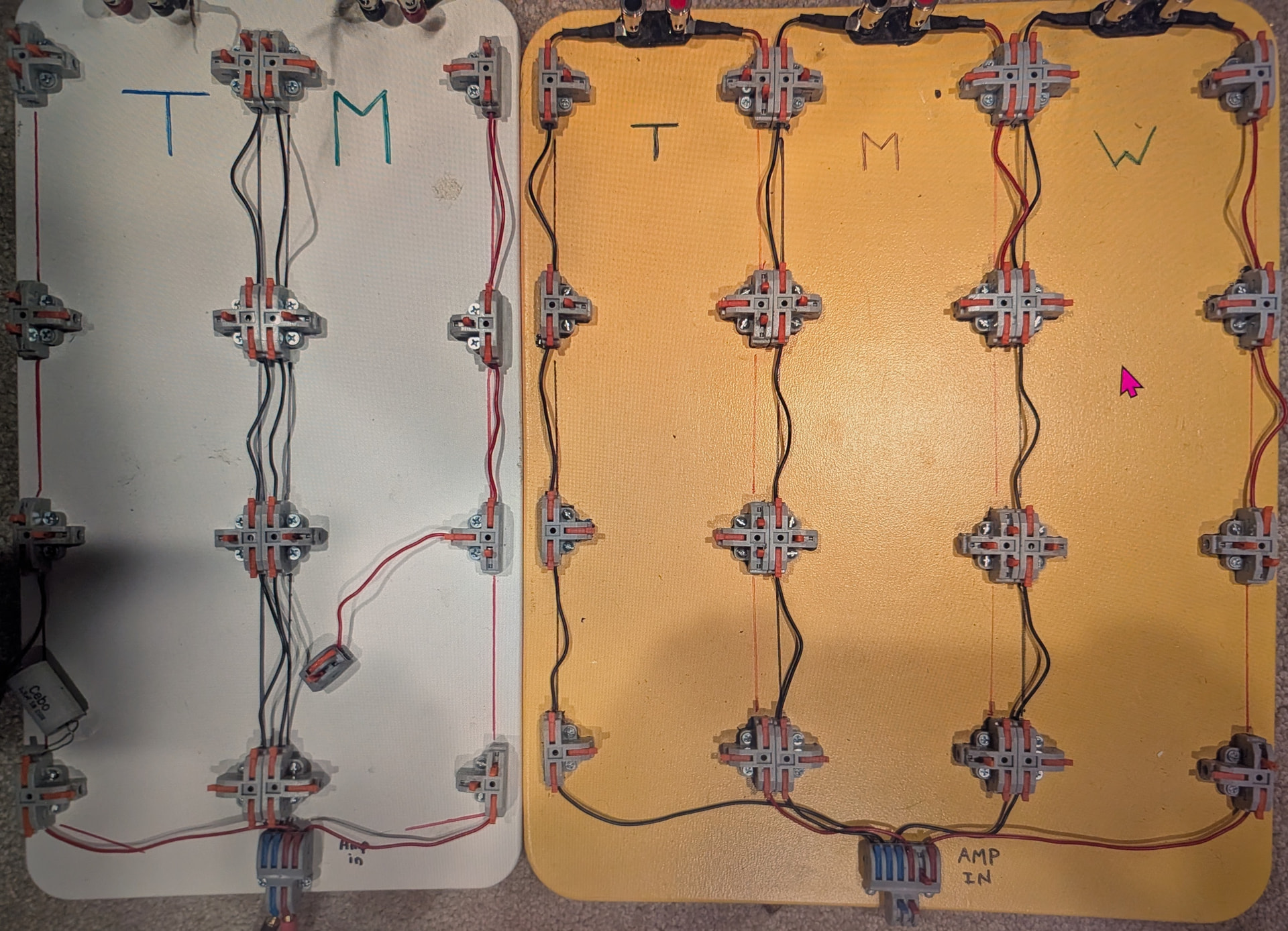 So today I discovered my entire life is a lie. Red line is running a lead directly from the speaker wire coming from the amp to each filter network (positive and negative). Green line is connecting the speaker wire to the woofer filter, then daisy chaining the positive and negative to the MR & Tw filters (how I’ve been voicing). Purple line is running speaker wire inputs to the Tw filter network, then daisy chaining the positive and negative to the Tw & woofer networks.
