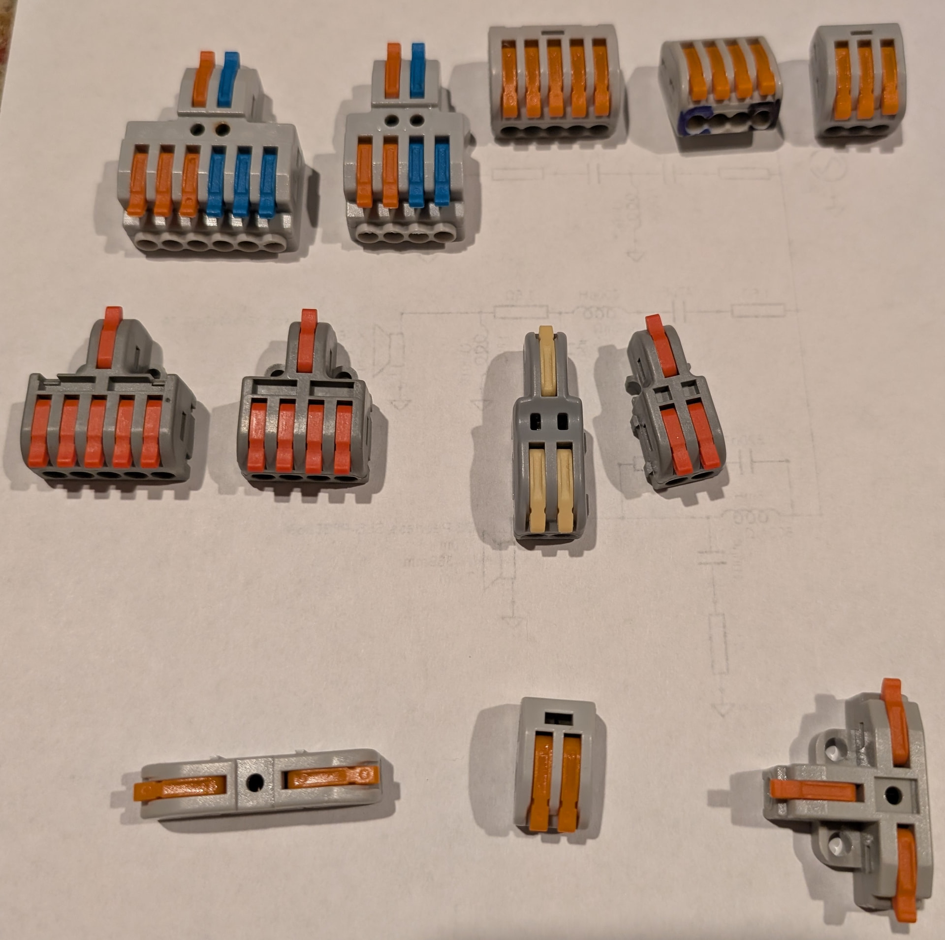. However, I am about to build new, revision 2, board using 3 and 5 conductor connectors. They come in tons of variations (see below) and I have several crossovers inside of speakers completely connected with Lever Lock connectors because I wasn’t convinced that I had a good FINAL xo that I wanted to solder up. I have bought mostly GKEEMARS branded ones off Amazon lately, but they all seem to be mostly the same. The T-shaped ones and a few others take small screws, but I mainly epoxy them down for the prototype boards. [The 2-in/6-out and 2-in/4-out are particularly good for taking the signal from the amp and sending it off to the individual drivers. You can see them at the “amp in” location of the prototype boards.]