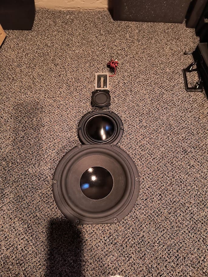 For upper mids, I don’t have any smaller dome mids in my current inventory, but I do have a pair of discontinued Techtonic BMS drivers that will cover the 1 kHz to 5 kHz range and integrate well to a small ribbon/planar above that.