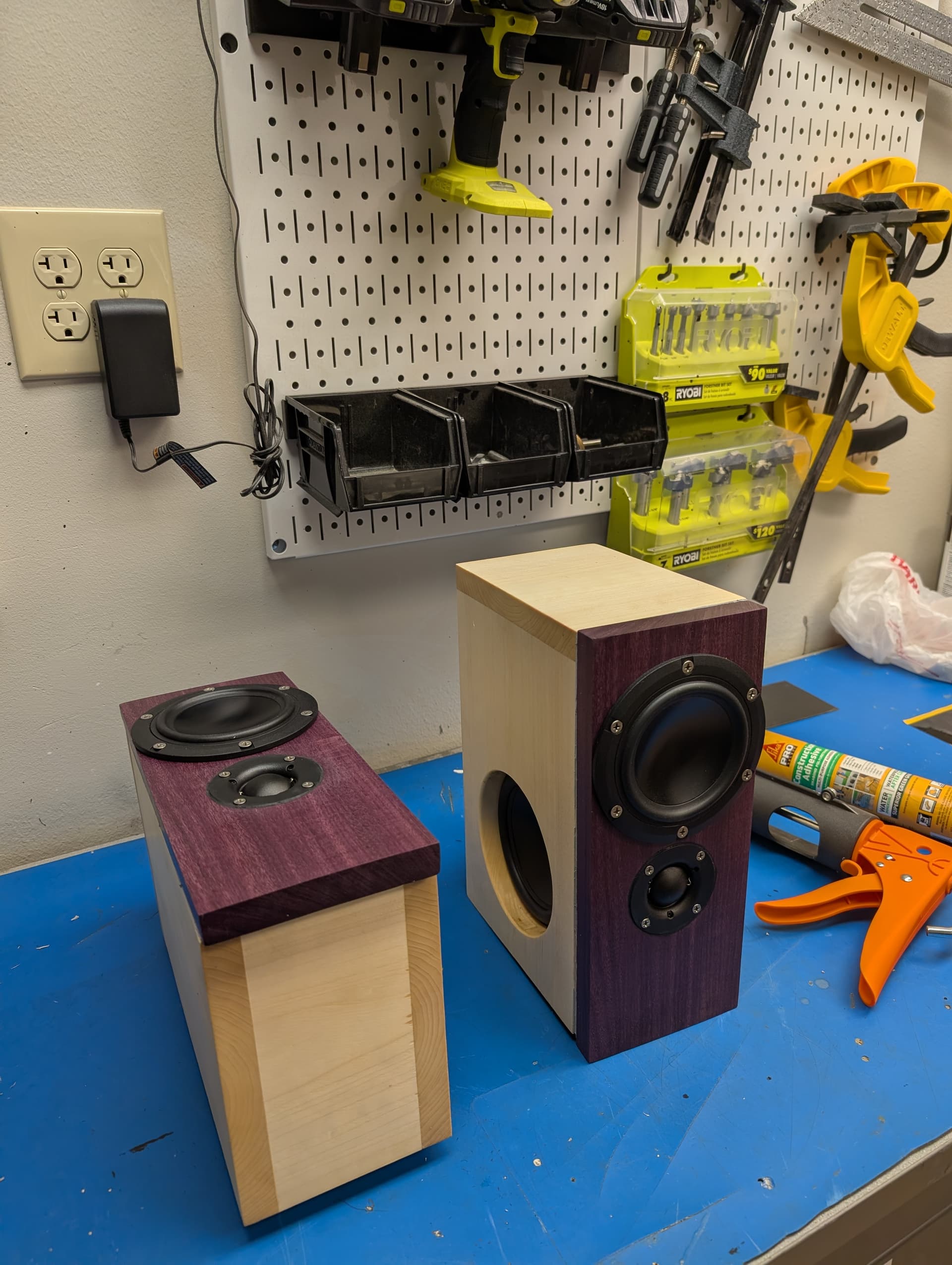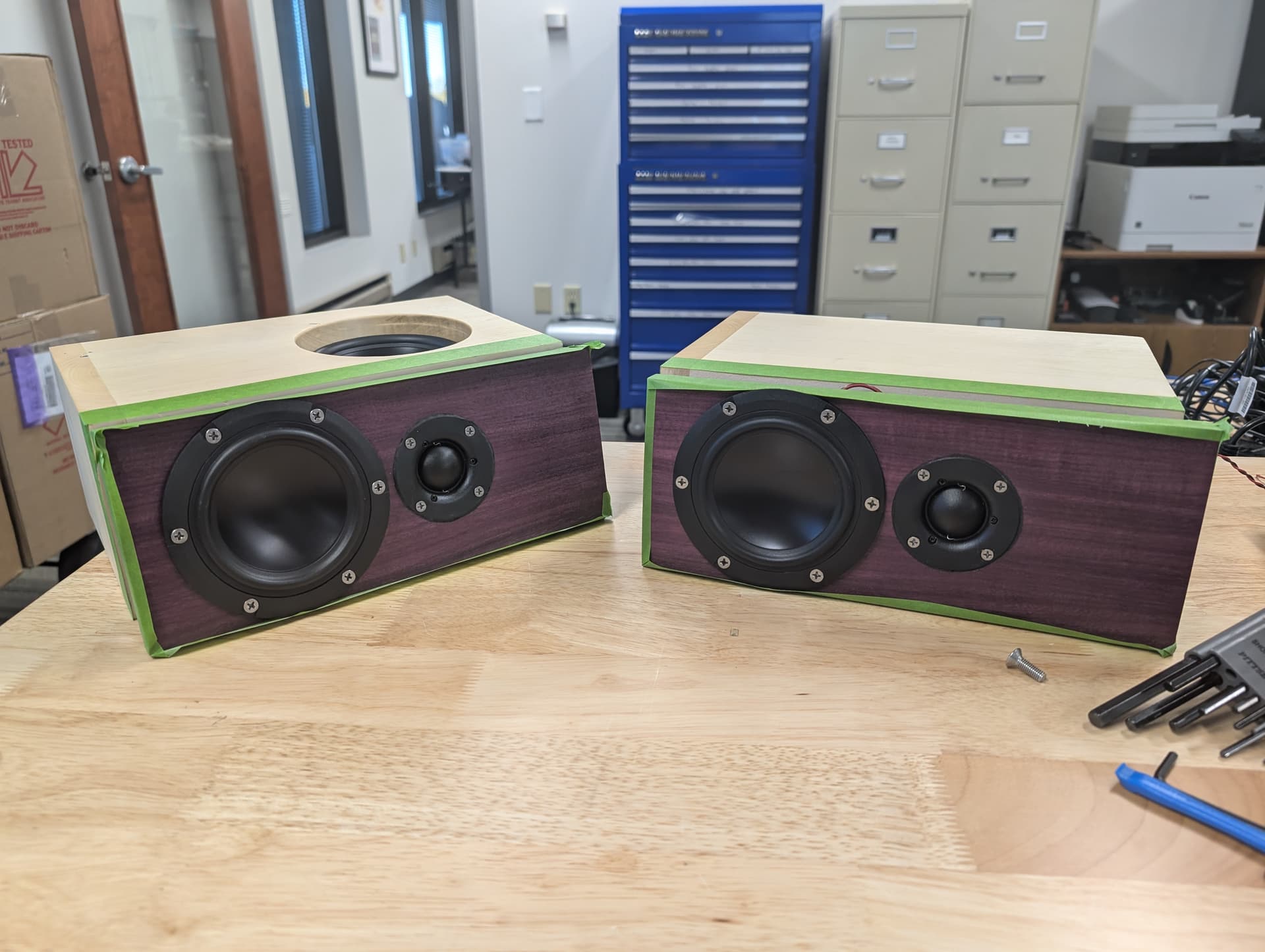 I posted on the old forums about the Figs; a purpleheart front baffle speaker made for a friend. I didn’t get it finished as soon as I would have liked, as I purchased a house! Fortunately, my friend is very patient and understanding. I finally got it finished a bit ago.