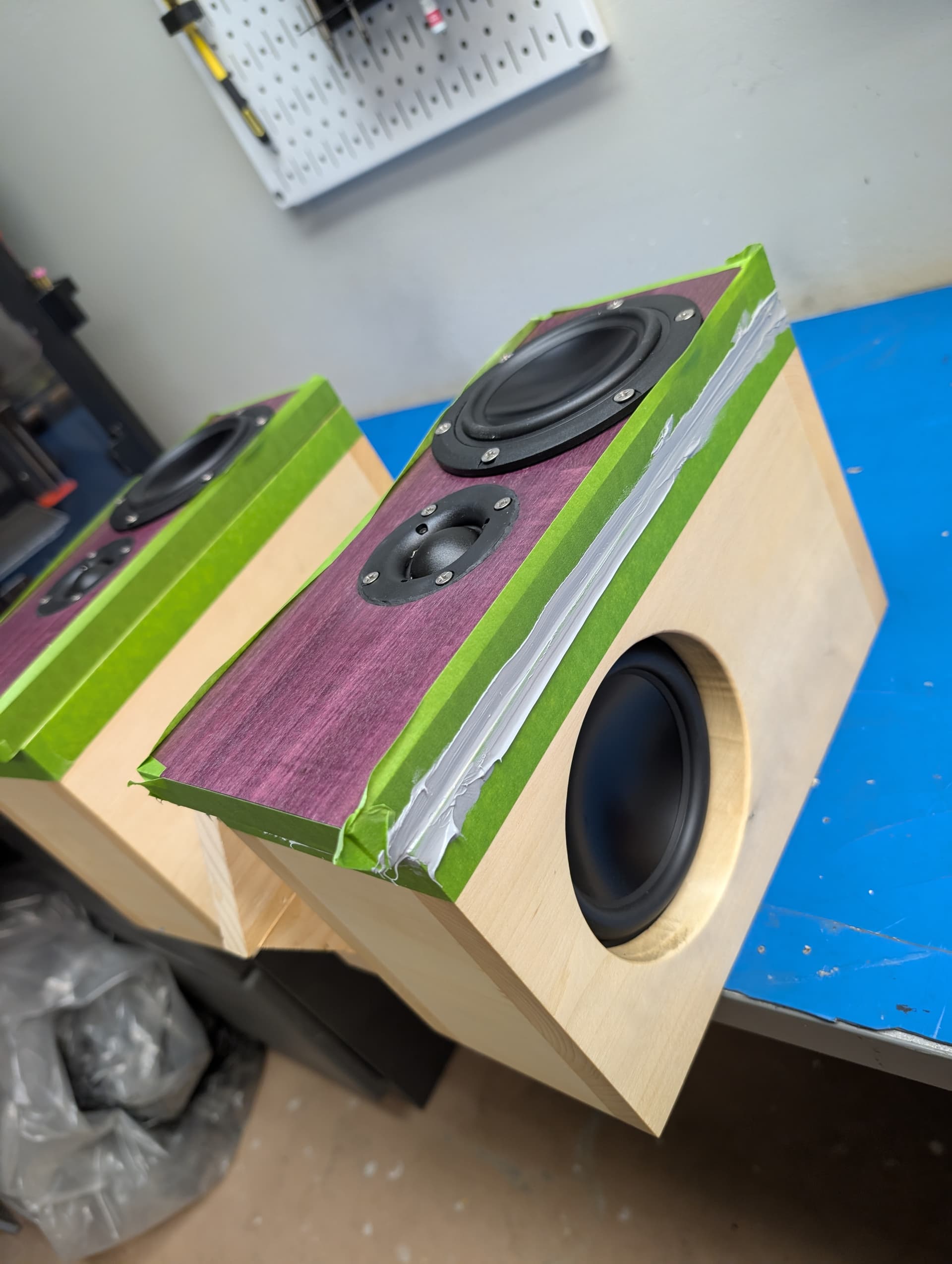 Some assembly pictures. For the front baffle, I used Sika construction adhesive. It should be very flexible. I’m hoping that will allow for any natural wood movement between the baffle and enclosure (baffle being solid purpleheart, and box being aspen) to shift without any cracking. Time will tell…