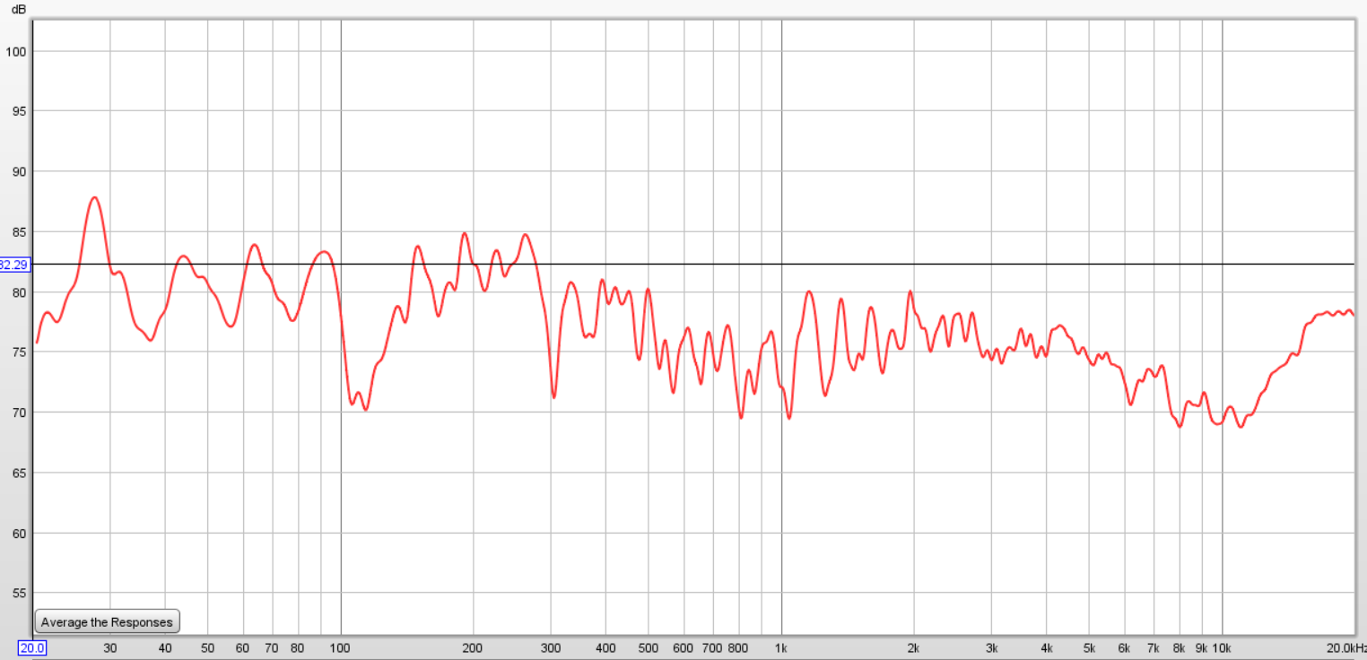 Measured sub and one mid/tweet only. Not flat by any means. This was the final measurement after an earlier flatter attempt sounded thin in the workplace. The large dip around 5k-14k was surprising because it was not apparent with listening. IMO, with both mid drivers ~14’ish inches apart, and the apparent lobing it creates, both the on and off axis sound like they fill in this area.