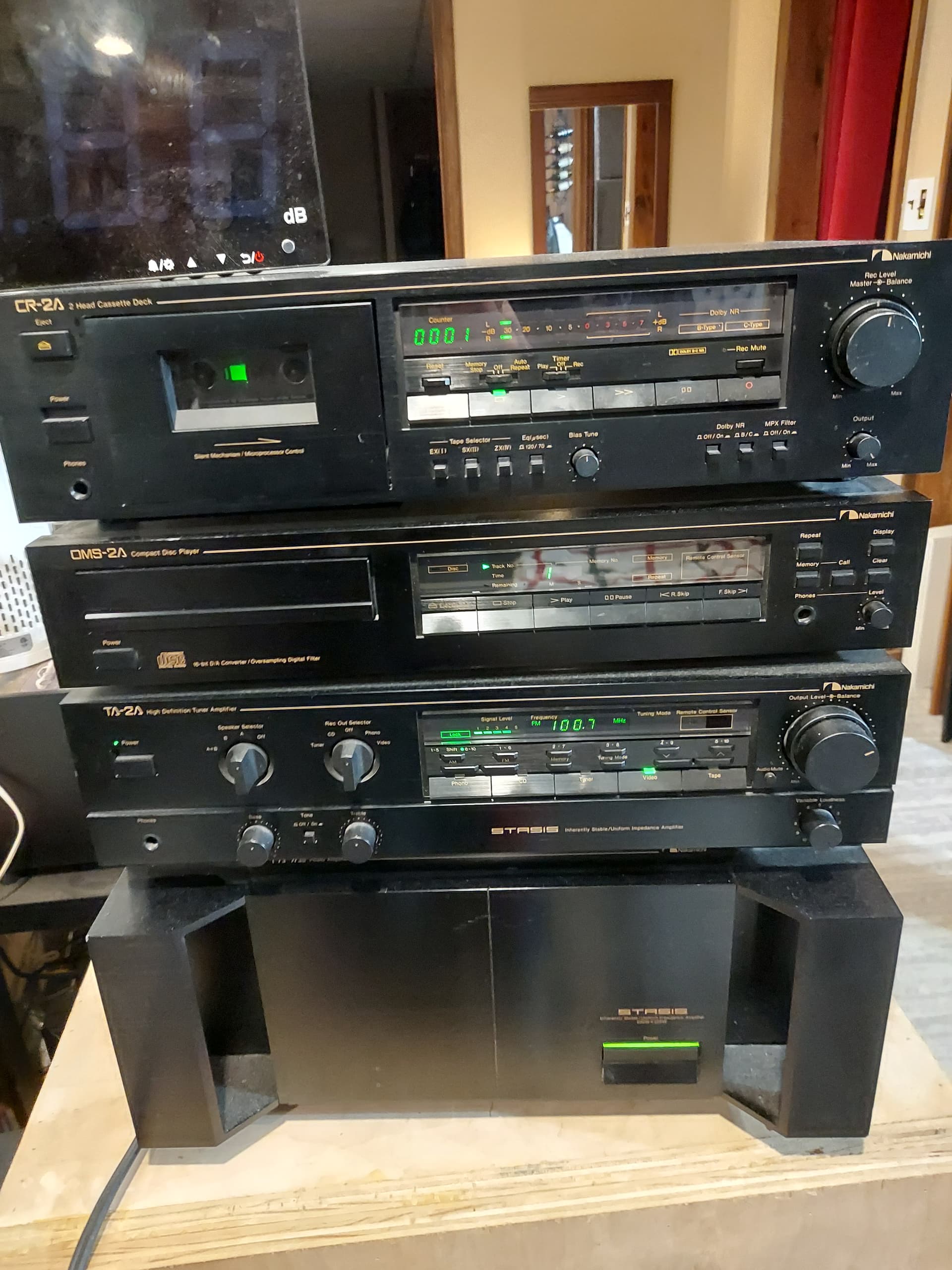 I have the TA-2A Nakamichi reciever that I am using as a preamp but alone puts out 50 wpc. Designed by Nelson Pass. The big amp on the bottom is the Nakamichi PA7. Also by Nelson Pass. 225 wpc into 8 ohms. 330 wpc into 4 ohms. It’s a great sounding amp. I prefer my Parasound amps from John Curl.